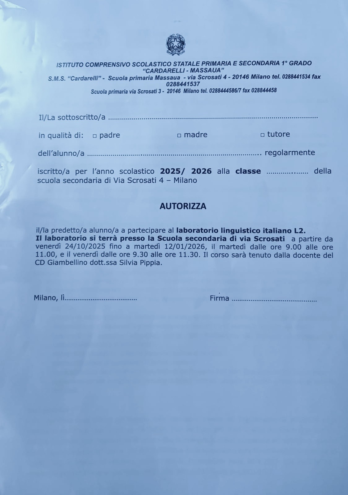 Con la presente si comunica che dal giorno venerdì 24 ottobre 2025 a martedì 12 gennaio 2026, si terrà il laboratorio linguistico di italiano L2 Ital-Base per a